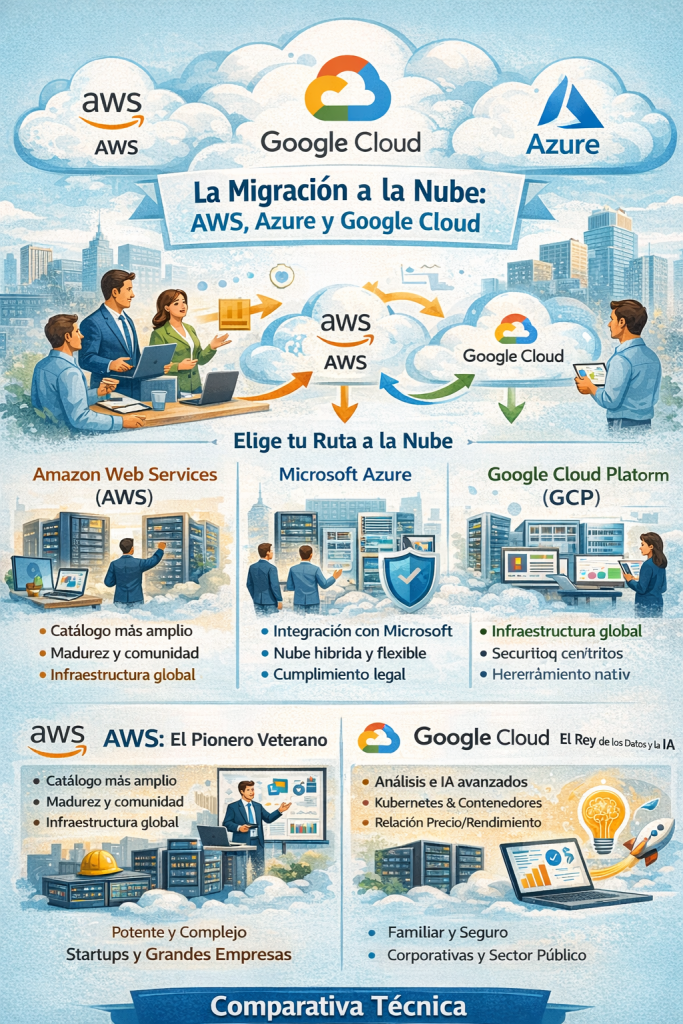 La migración a la nube ya no es una opción, es el estándar. Sin embargo, para muchas empresas, la pregunta ha pasado de ser «¿debemos subirnos a la nube?» a «¿qué nube nos conviene más?». En el mercado actual, tres gigantes dominan el panorama: Amazon Web Services (AWS), Microsoft Azure y Google Cloud Platform (GCP).
