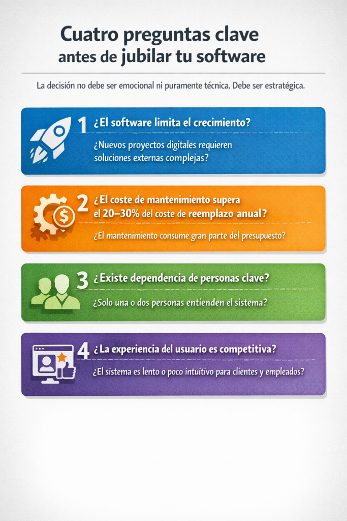 En estos casos, jubilar el software puede ser prematuro. Lo inteligente es analizar si una inversión controlada puede extender su vida útil con rentabilidad.